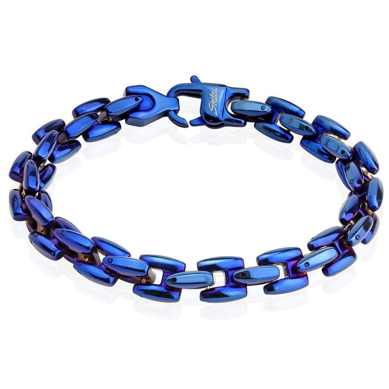 This is a very striking and unusual stainless steel gents bracelet, with a metallic blue ion plating from Spikes™ biker jewellery. The bracelet is solid, chunky and substantial it measures 225mm long and 9mm wide.