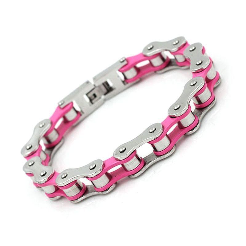 An appealing ladies motorcycle chain bracelet, made in stainless steel, which is decorated with pink ion plating on the inside links. The bracelet measures 210 mm in length (8.27") and is 10 mm wide, it fastens with a secure clip at the back.