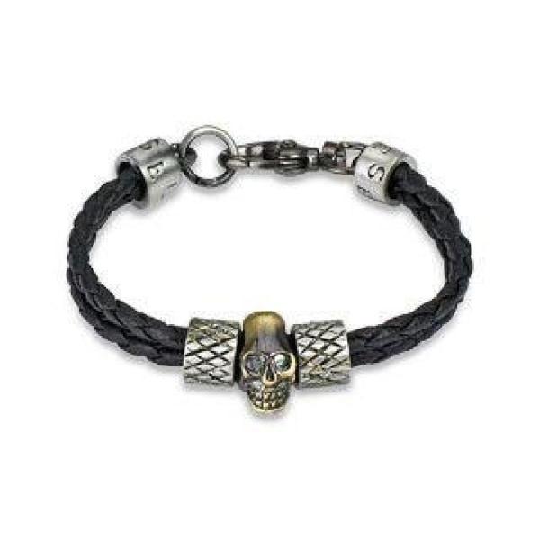 This bracelet has double weaved leather strands with a brass coloured skull with two dark patterned stainless steel beads on either side. With a large sturdy crab claw clip. Measures 8 1/4".