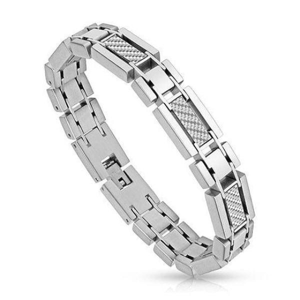 You will love wearing this attractive, stainless steel bracelet, which is decorated with five white carbon fiber links. This superb bracelet is 8.35" long, 12mm wide and 5mm thick.