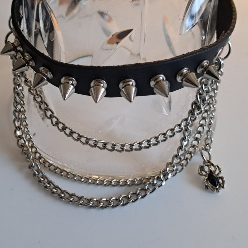 Unleash your inner rebel with our Leather Spikes With Chains and Spider Choker! Embrace the bold and edgy look with this statement piece, perfect for adding some attitude to any outfit. Don't be afraid to make a statement and stand out from the crowd. This awesome design may cause some serious jealousy from friends!