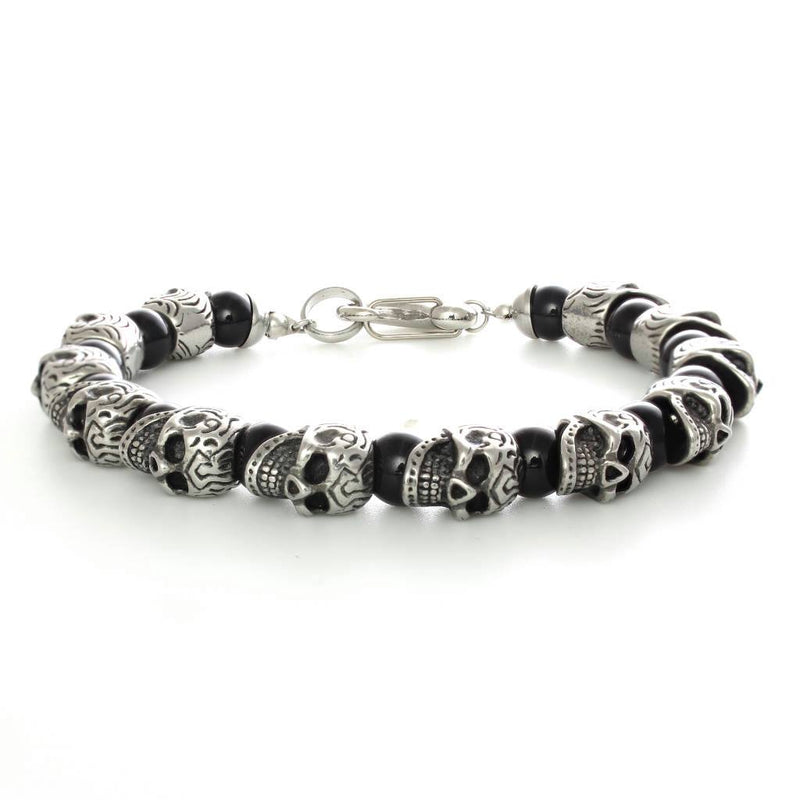 An epic skull bracelet with beads. Crafted from stainless steel, this bracelet has a mix of plain beads in a black colour and detailed skull beads in silverMeasures 220x6mm