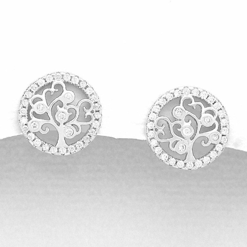 This is a stunning pair of earrings with a tree of life design inside a circle which is decorated with cubic zirconias around the outside and more cubic zirconias on the tree.