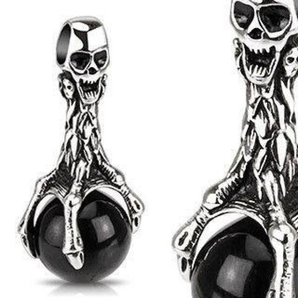 Undoubtedly an unusual and menacing design, this stainless steel biker pendant features an eagle claw with skull design, which is holding a black orb. Measurements - 44x21x21mm. Will fit a chain up to 4mm wide