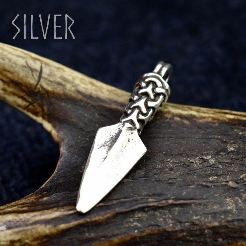 This is an intimidating dagger style sterling silver pendant from Asgard, which is based on a traditional Viking style. The pendant comes set on a black leather string and with a gift box.Weight - 14.5 gramsMeasurements - 12mm x 47mm