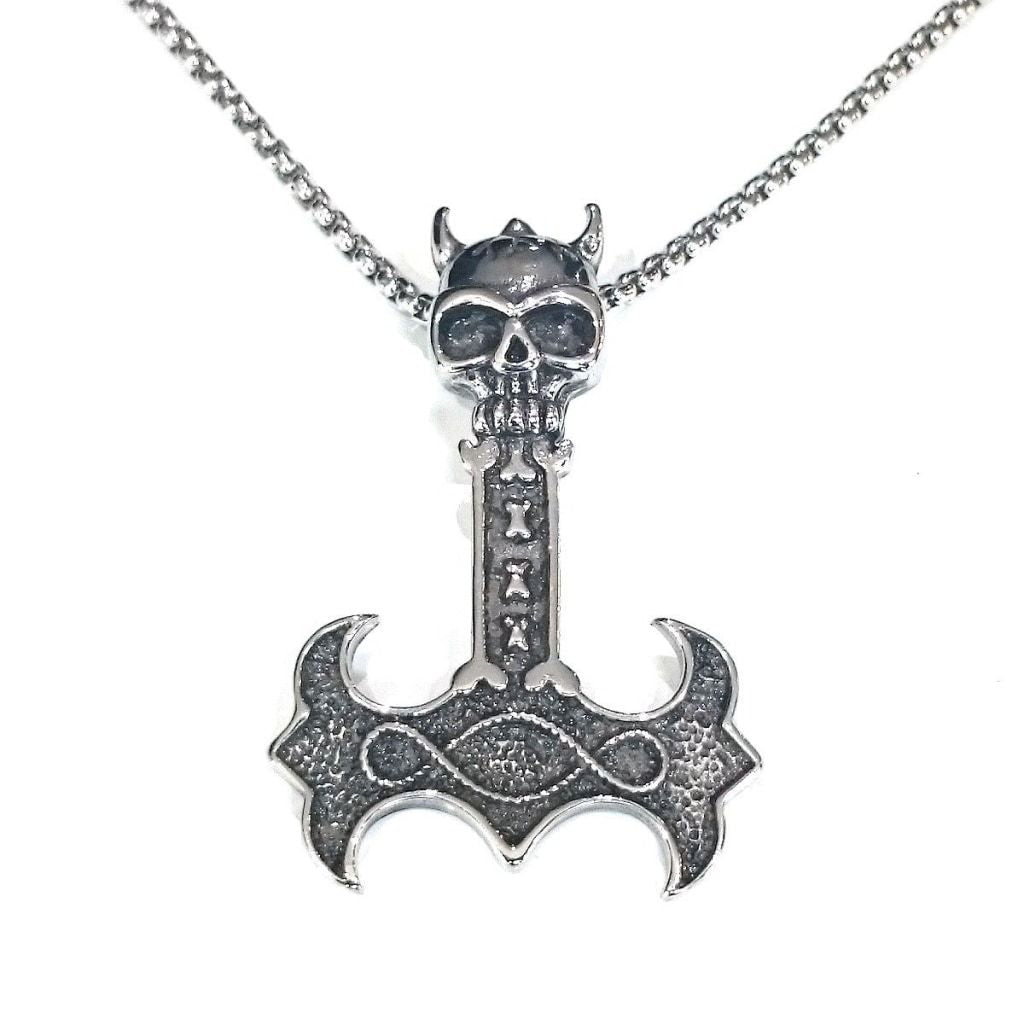 A wicked looking pendant that pays homage to Thor, the old god of Thunder. Made in stainless steel with an axe acting as the hammer head and a skull for the pommel. Will fit a chain up to 4.5mm wide.