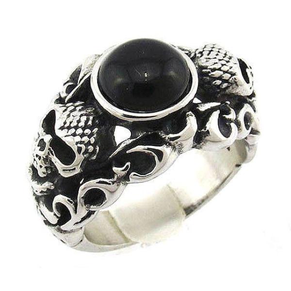 This intimidating biker ring has a central cabochon cut black gemstone and skulls on the shoulders and is made in stainless steel.