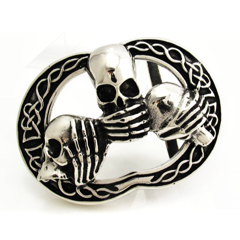 This is an eye-catching biker belt buckle design with three skulls representing the ancient Japanese proverb of the three monkeys, see no evil, speak no evil and hear no evil. The three skulls design is further embellished with a Celtic knotwork detail on the surround. This style is made in stainless steel.