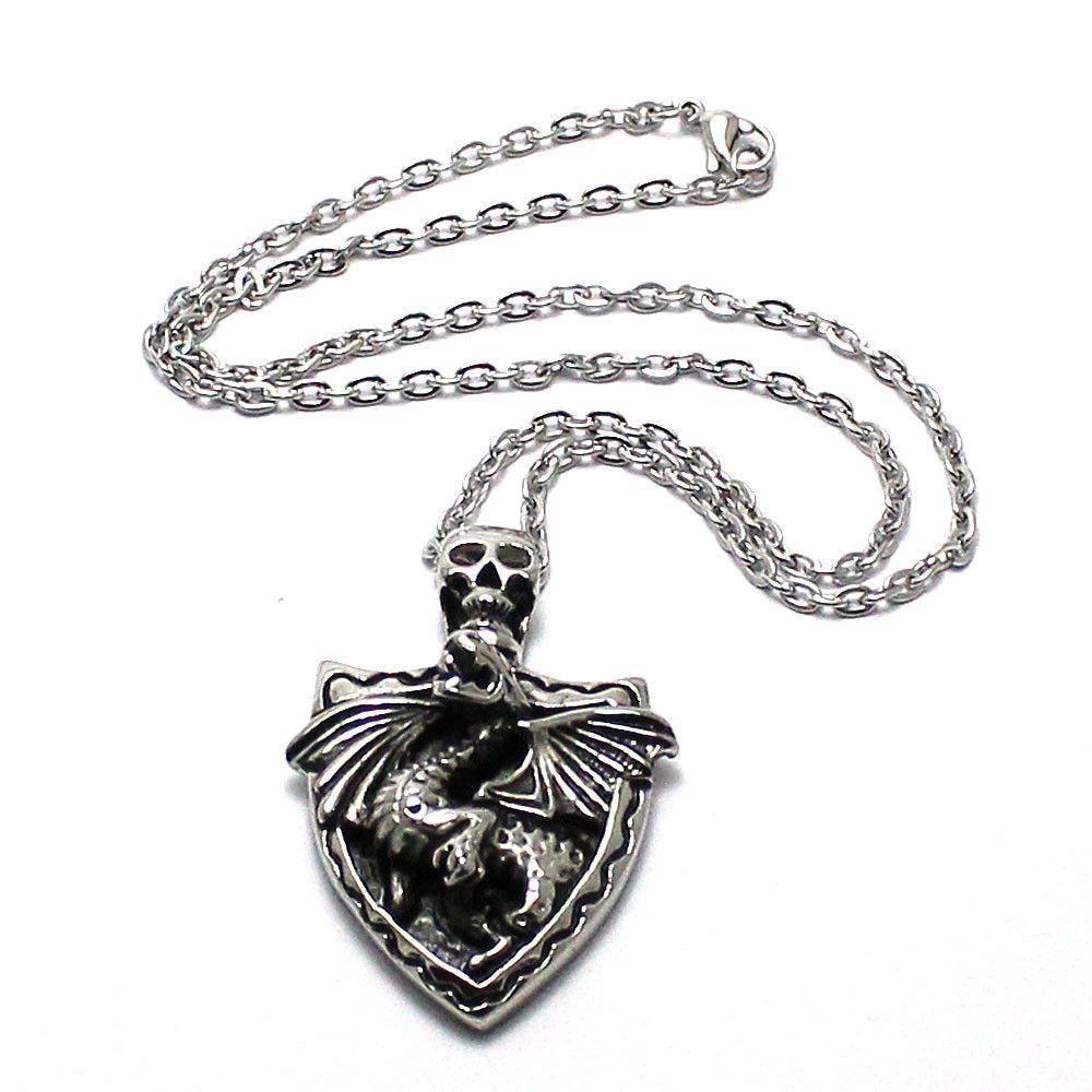 A superb pendant, with a shield design, decorated with a detailed flying dragon design. The bale of the pendant is in the shape of a skull, which really adds interest to this excellent design.