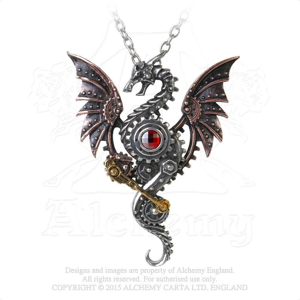 Take to the skies with your mechanical, fire breathing companion who will surely cause some agro. This "Blast Furnace Behemoth" from Alchemy is no small friend. Made from tri-toned pewter and centrally set with a square cut Swarovski crystal with the entire pendant on an 18inch/46cm trace chain.