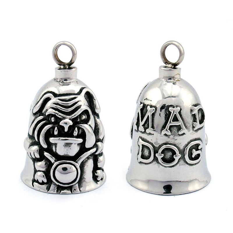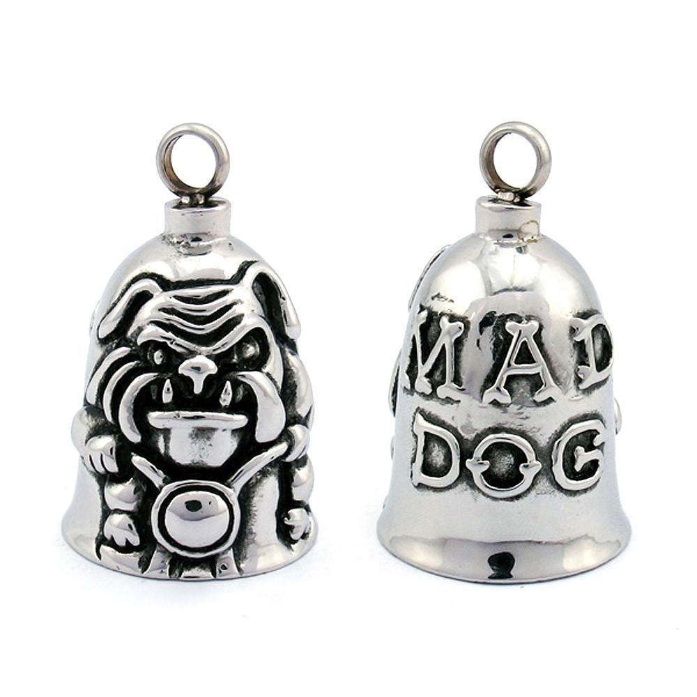 An awesome and substantial biker bell made in stainless steel with a design of a bulldog on a bike on one side and the caption "Mad Dog" on the reverse, it has a moving steel bell ringer inside.