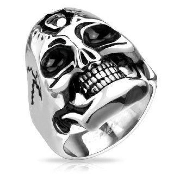 A grisly and chilling Frankenstein skull ring, superbly crafted in stainless steel with a substantial weight and size. Measures 26mm wide, an intimidating biker jewellery design.