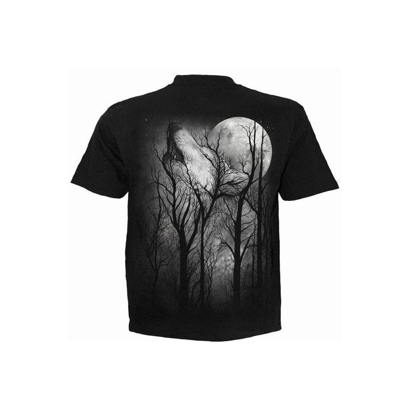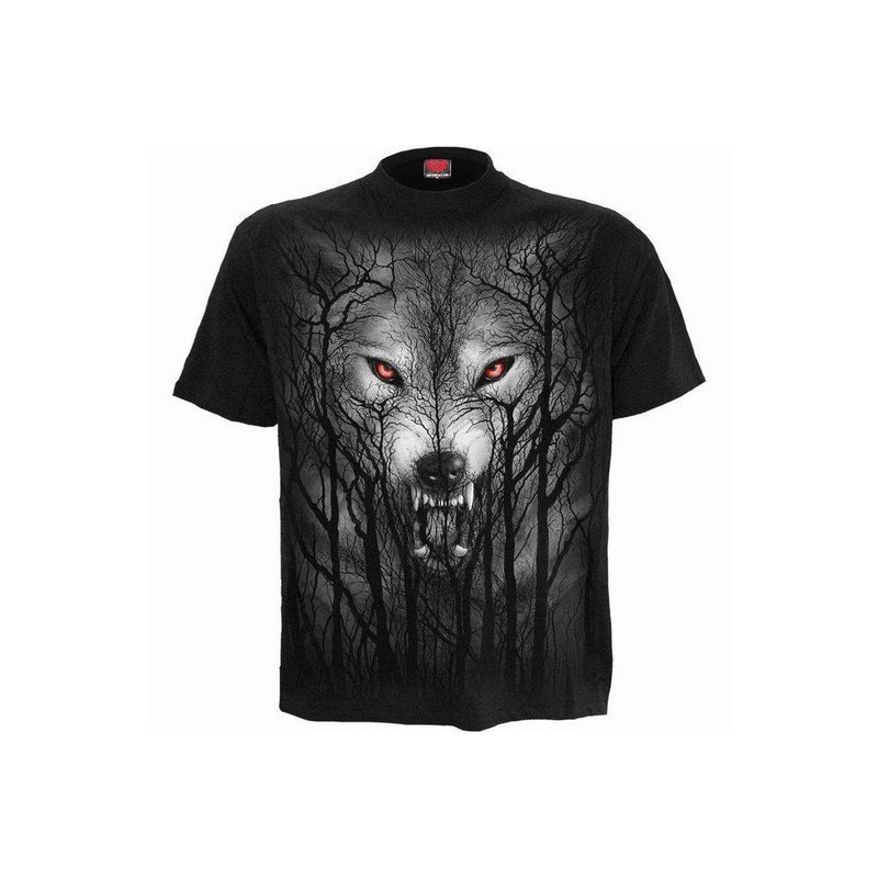 A phenomenal mens t-shirt with a formidable front and back print of lone wolf with glowing red eyes and sharp white teeth, hunting during the night of a full moon!
