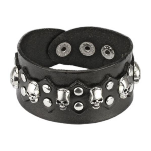 This biker bracelet in black leather is embellished with steel skulls and dome studs and has a three length adjustable snap button closure.
