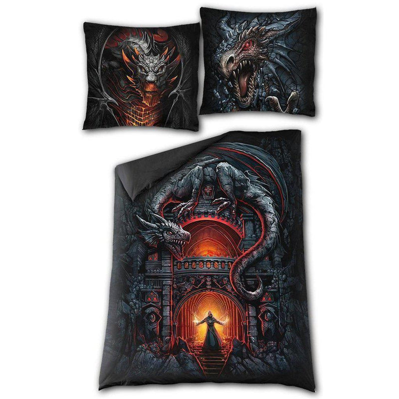 A striking Spiral single duvet cover with pillow case, which features a fire breathing dragon print, made in 100% cotton.