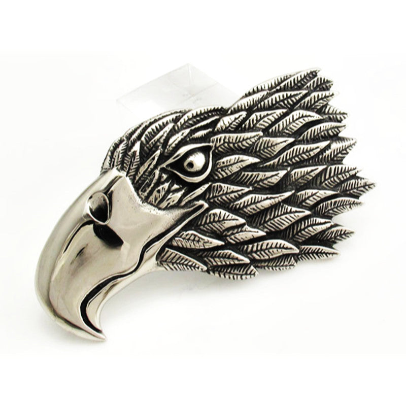 This is a striking biker belt buckle, made in stainless steel, with a detailed and textured eagle head design.