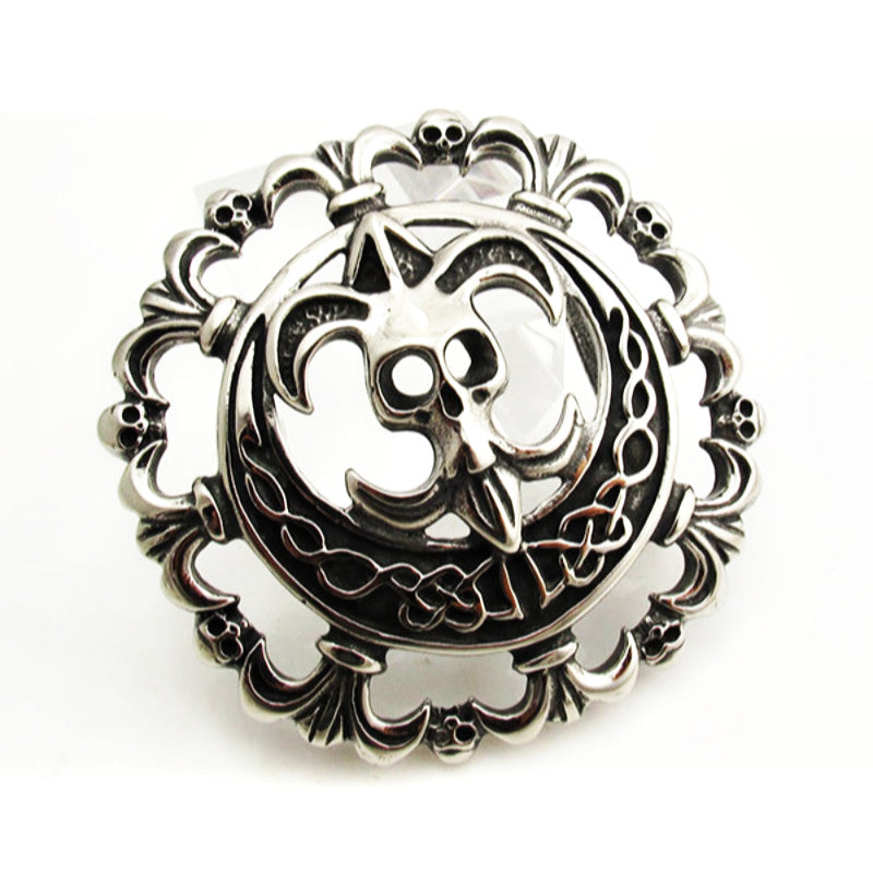 A knockout belt buckle with a central skull design on a fleur de lis, with a Celtic knot detail and skulls around the outside. This style is crafted in stainless steel and is ideal for bikers or goths.