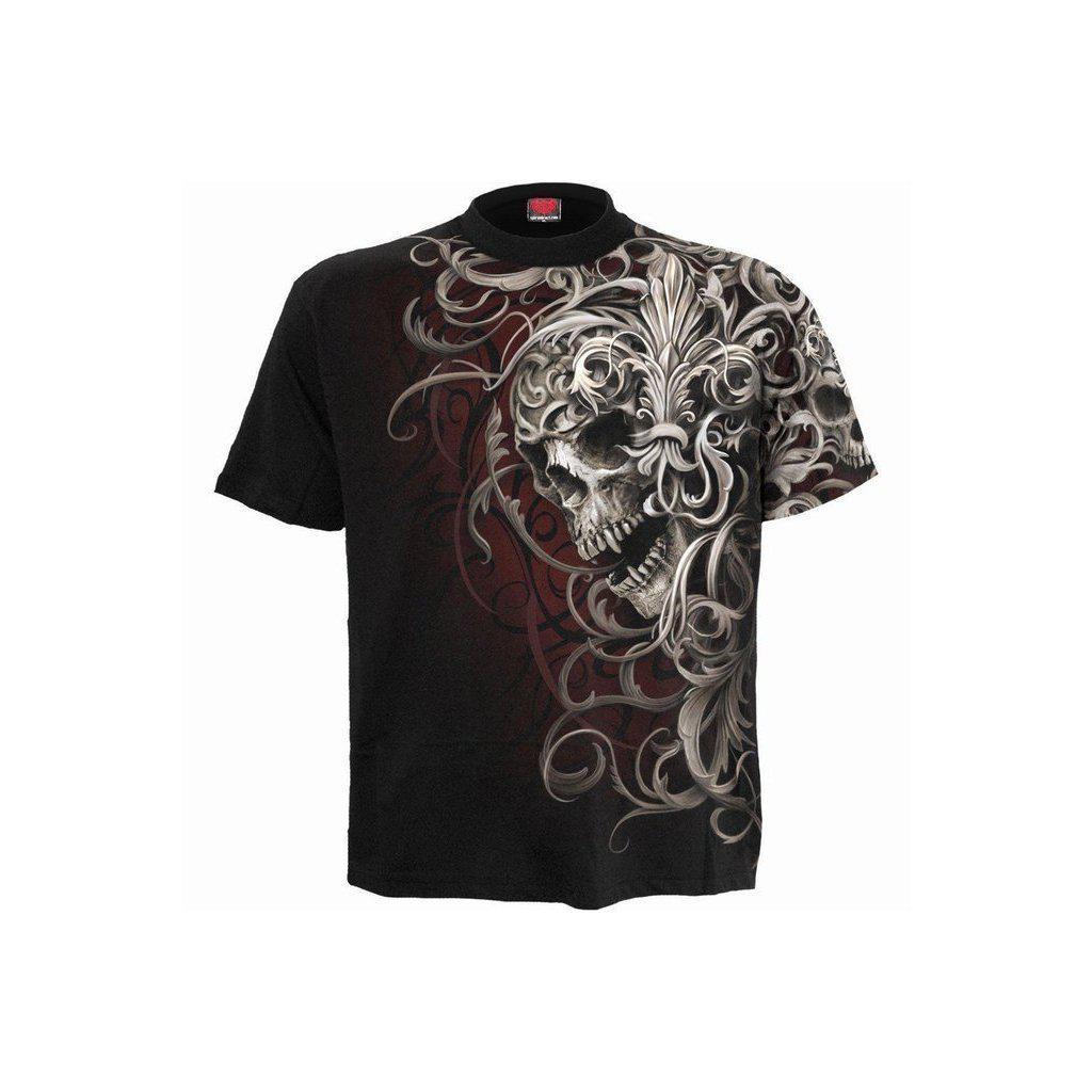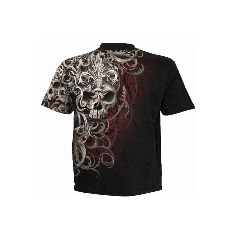 A creepy mens t-shirt with slinkster allover print of intricately carved skull and ancient tribal patterns!