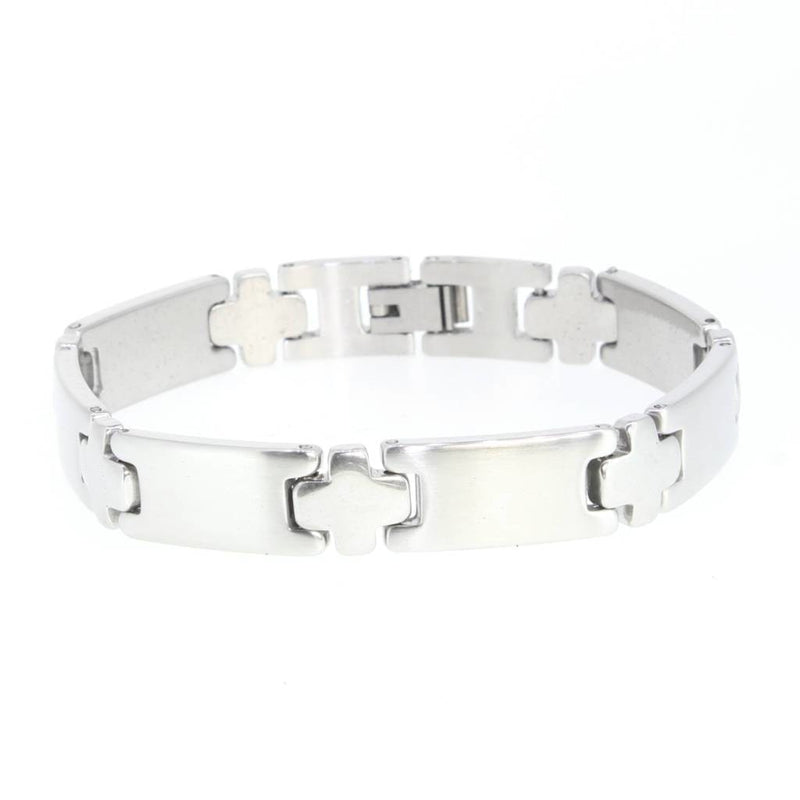 A stylish mens stainless steel bracelet with satin finish links, the bracelet fastens at the back with a secure clip. The bracelet measures 8 inches in length and 10 mm wide.