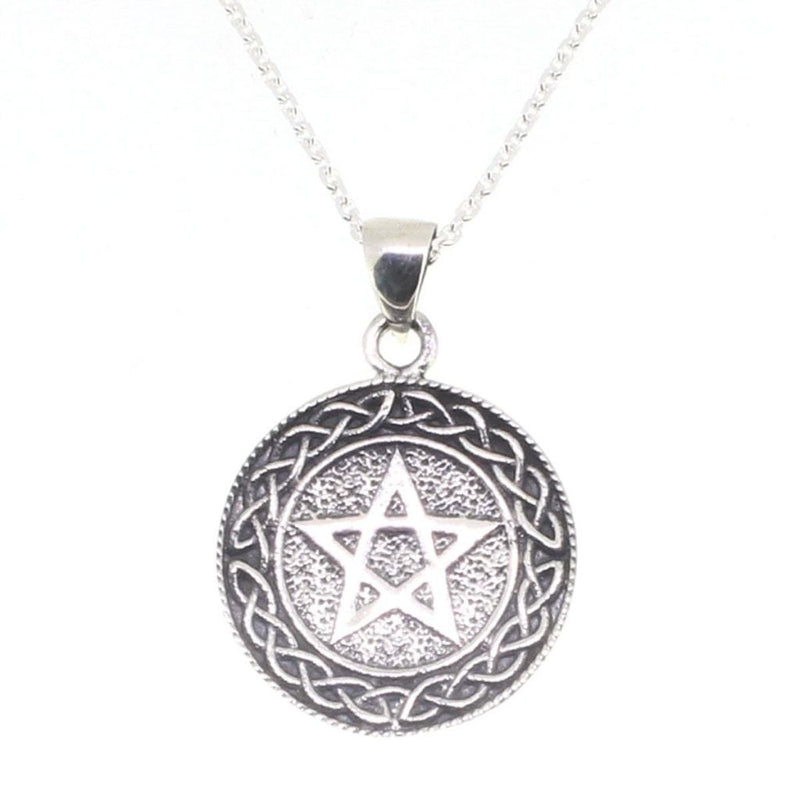 This attractive, circular, sterling silver pendant features a pentagram design, surrounded by textured details and a circle of celtic knotwork on the outside. Diameter - 21 mm.