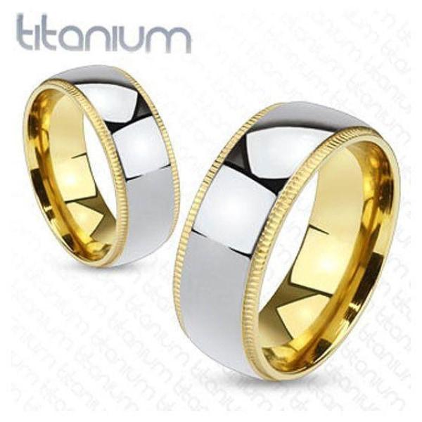 An exceptionally attractive titanium ring design, which is 8mm wide with grooved, bevelled edges, the design is enhanced inside and at the edges with gold ion plating for an appealing two-tone effect.